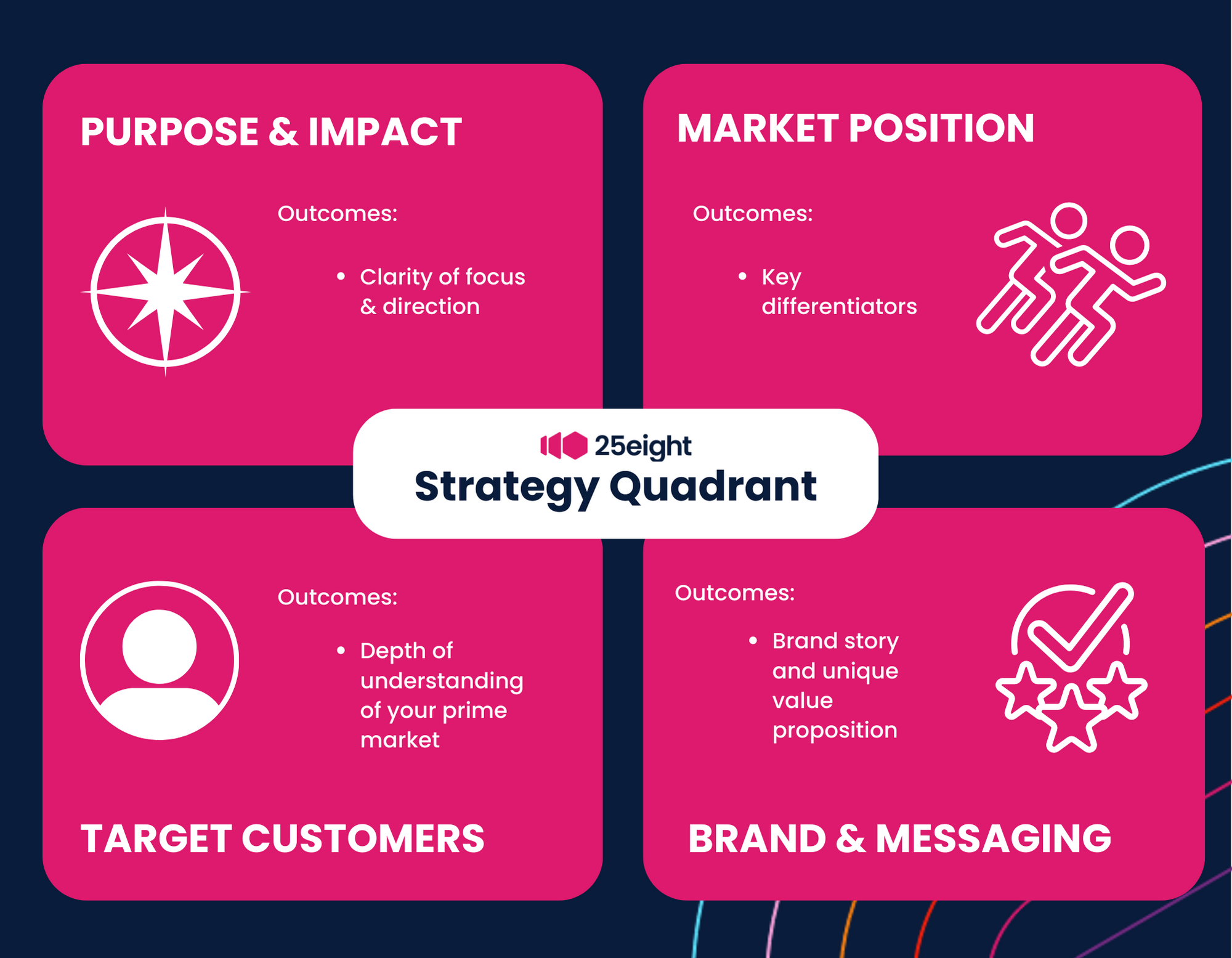 Following 25eight’s methodology, you will have a proven structure to level up what you already know and do to identify your business’ true value in the market, and develop that into a compelling value proposition that motivates your audience to take action. Your approach will change your pitch from being capability-focused to solution-focused so that your audience becomes active listeners.